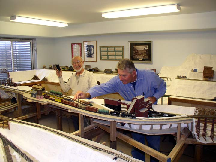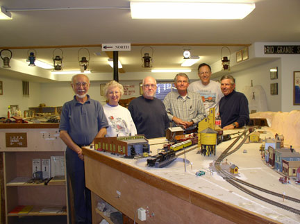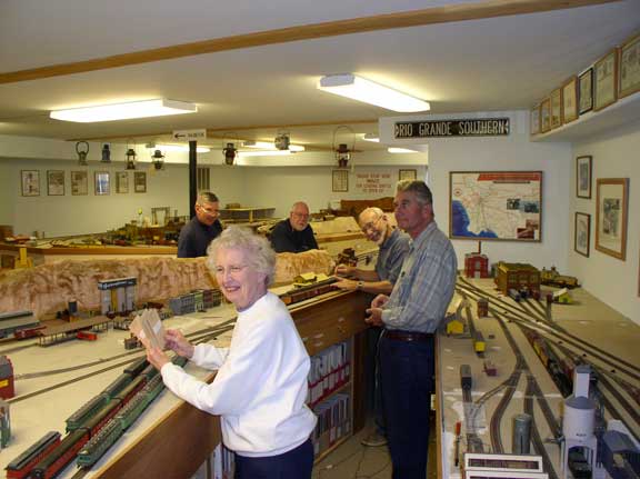1) Our most recent operating sessions was on February 13th 2008. The crew members, shown below, are l to r: Tom Hillhouse, Jack Sibold, Tom DeStefano, Connie Schaeffer, and Bob Schaeffer. This yime we ran the narrow gauge division of the Denver and Southwestern Railroad. The crew made up the train in Ouray and proceeded to Placerville via Koch's Creek, Montrose, Silver Lake, Red Mountain, Silverton, and Ophir, finally returning to Ouray. Each town visited had a switch engine on hand while the road engin was newly acquired K-27 #463 with sound.