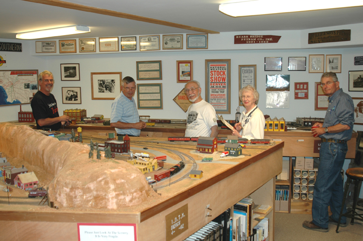 2) The photo below shows the crew (from l to r: Jack Sibold, Keith Kock, Bob and Connie Schaefer, and Tom Hillhouse) making up the train in the South Salida Yard on May 10, 2007. The trains delivered and picked up cars at North Salida, Montrose, Sneffles, Grizzly, Belden, Montrose and Ridgway before ending the run at Santa Fe. Jim Pettengill also came over to view the railroad.