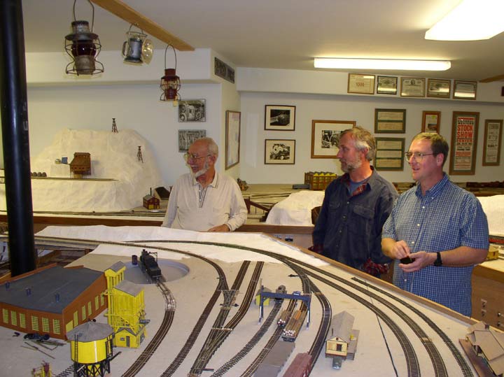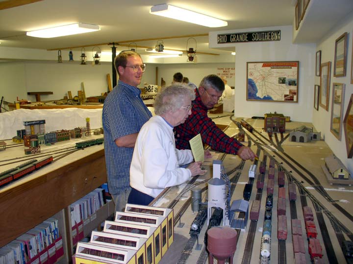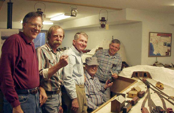 7) On December 7, 2002 the D&SW hosted its first operating session. The crew consisted of Don Paulson, Greg Posta, Tom Hillhouse, Bill Tipton and Keith Koch (left to right in the photo below). The crew made up an 8 car train in the South Salida yard and then delivered and picked up loads in North Salida, Gunnison, and Montrose. The shot below shows the happy crew about halfway through the four hour operating session. Brakeman Greg Posta is holding his favorite uncoupling tool while engineer Bill Tipton has control of the throttle for the D&SW Pacific switching the Gunnison area.