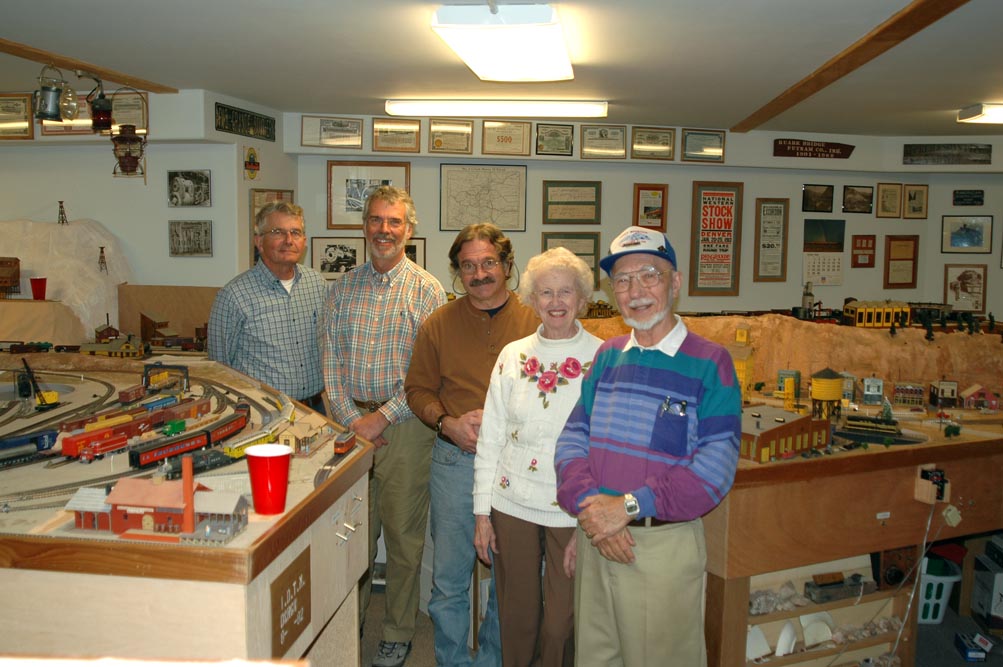 4) During the first 2004 session in mid October we operated the standard gauge division. Keith Koch, Connie Schaeffer, Bob Schaeffer, Don Paulson, Tom Hillhouse, and Robb Ruyle were present. In the first picture Connie, our conductor, is handling the car cards while Bob, the brakeman, and Tom, the Engineer await there orders. Robb and Keith are offering suggestions for switch moves. The second pictures shows the complete crew.